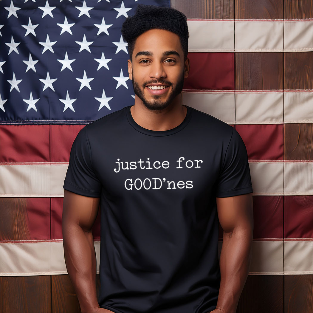 Designed for protests, rallies, community events, or everyday wear, this shirt speaks to people who believe justice should be rooted in goodness, humanity, and collective responsibility. Whether interpreted as wordplay, symbolism, or intentional emphasis, the message invites conversation and reflection.